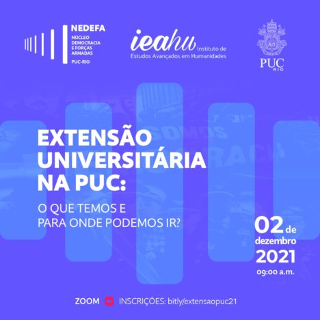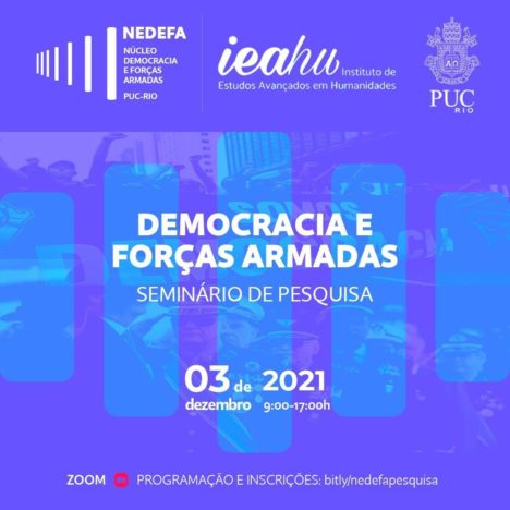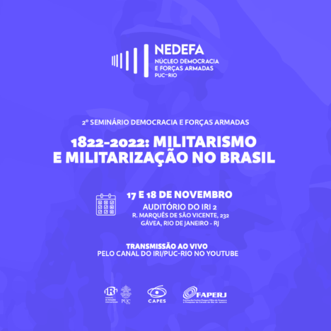 SeminarNovember 17 and 18, 2022The 2nd Seminar on Democracy and the Armed Forces will be held by NEDEFA at the IRI 2 Auditorium at PUC-Rio, with online broadcasting.